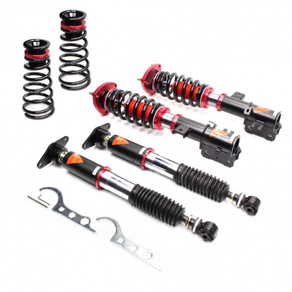 The Godspeed Project MAXX coilover for 2014-2018 Mazda 3 (BM/BN) is for the tuners that want a track oriented setup that also provides daily commute comfort. With 40 levels of damping valve adjustment, you can easily adjust from stiff to soft simply by twisting the knob. Featuring mono-tube design with large capacity 52 mm dia. JIS seamless carbon steel shock body filled with IP F.A. 5W damper oil with properly valved 44 mm internal pistons to endurance competitiveness on a track course or daily spirited driving on public road. Cold wound springs are made from high tensile SAE9252 steel to ensure durability. Vehicle ride heights are adjusted with lower brackets to offer maximum shock travel in order to provide comfort compared to lowering springs alone. Mostly billet aluminum hardware accessories are used for its weight saving property in order to reduced overall weight of the coil-over system yet remain durable. All parts are replaceable and most importantly shock absorbers can be rebuild for customization or simply purchase replacement cartridge without spending too much for complete new coil-over system. You will experience quicker response times, improved bump absorption and increase grip to increase the safety when pushing your car to the limit!